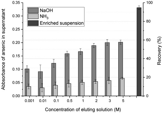 Evaluation of NaOH and NH3 for arsenic desorption from the MNPs. Arsenic absorbance in the supernatant, after carrying out the desorption with 300 µL of the alkali and 10 µL of an MNPs suspension enriched in arsenic. Mean values (three measurements); error bars represent the corresponding standard deviations.