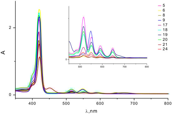 The UV-vis spectra of newly synthesized compounds 5, 6, 8, 9, 17–21 recorded in CH2Cl2 and compound 24 recorded in (CH3)2CO are shown in Figure 1. Most of them demonstrate an intense Soret band between 419 and 421 nm, only for a maleimide-substituted conjugate 24 the corresponding band was found at 416 nm likely due to an increase of HOMO-LUMO energy gap.