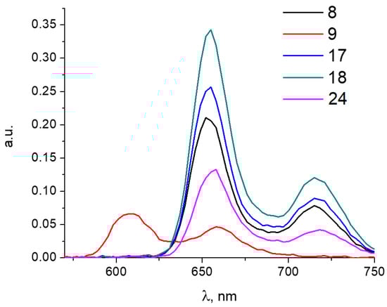 Fluorescence spectra of synthesized compounds 8, 17, 18, 24 (Figure 2) were similar, showing two maxima at 655 nm and 715 nm. The spectrum of porphyrin 9 also showed two fluorescence peaks, with maxima at 610 and 660 nm, which can be explained by the presence of zinc in the molecule.