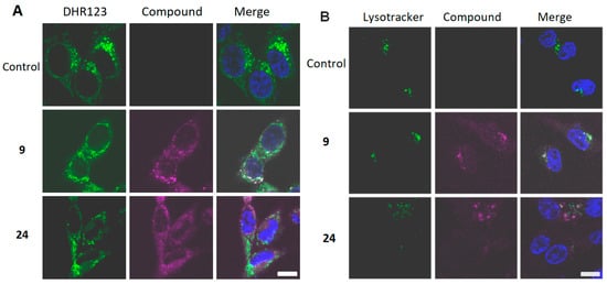Cytoplasmic distribution of compounds 9 and 24. The HCT116 cells were loaded with 9 and 24 (10 μM each) for 24 h at 37 °C, 5% CO2 in the dark. Colocalization with mitochondria (A), lysosomes (B). Bar, 15 µm.