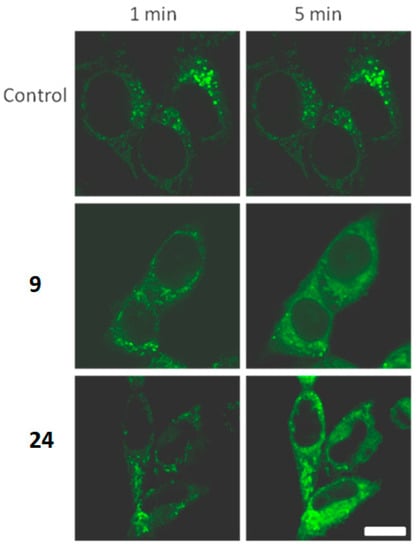 Both 9 and 24 were distributed in the cytoplasm but not in nuclei. Both compounds colocalized with mitochondria and lysosomes. Compound 9 was distributed as granules. In addition to mitochondria, its colocalization with the lysosomal dye was clearly detectable. For compound 24, accumulation in lysosomes was less pronounced. During activation with the microscope laser at 405 nm (excitation of Hoechst 33342) an increase in the ROS probe dihydrorhodamine 123 (DHR 123) (Figure 4).