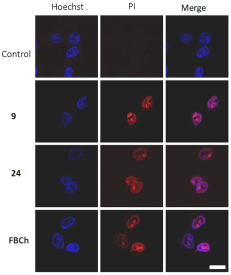 PI entry (necrosis) after light excitation of HCT116 cells loaded with indicated compounds for 24 h (10 μM). Photoexcitation was carried out with the microscope laser for 5 min at 405 nm for 9, 24 and FBCh. Bar, 15 µm.