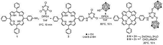 Porphyrin 1 as N-nucleophile was reacted with compound 2 (molar ratio 1:1) at 0 °C in THF in the presence of N,N-diisopropylethylamine (DIPEA) to afford conjugate 3, in which one s-triazine chlorine atom was substituted with porphyrin substituent [62]. Its formation was confirmed by disappearance of 1 by TLC analysis in hexane-CHCl3 (2:3) system. The reaction was completed in 10 min and, after the separation, conjugate 3 was isolated in excellent (97%) yield. The conjugate 3 was used as key compound in step-wise substitution of the s-triazine chlorine atoms with carborane nucleophiles. The conjugate 3 prepared as describe above but without isolation from the reaction mixture was further reacted with an excess of 9-mercapto-m-carborane 4 [63] at 65 °C in THF in the presence of DIPEA for 10 h (Scheme 1) to give compound 5 in 82% yield. Treatment of 5 with Zn(OAc)2.2H2O in CHCl3-MeOH mixture afforded corresponding zinc complex 6 in 95% yield (Scheme 1).
