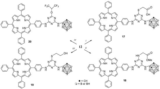 It turned out that we failed to replace the remaining chlorine atom in conjugate 12 with carborane 10, but its substitution proceeded easily when reacting with thioglycolic acid (13), methyl ester of glycine hydrochloride (14), mercaptoethanol (15) and hexafluoro-2-propanol (HFIP) (16) in THF in the presence of DIPEA or DIPEA/DMAP system in THF to give corresponding derivatives 17–20 in rather good yields (Scheme 5). It can be also assumed that simultaneous introduction of substituents with COOH, COOMe, OH and CF3 functional groups along with porphyrin and carborane ones in s-triazine system may improve the biological characteristics of resulting compounds.