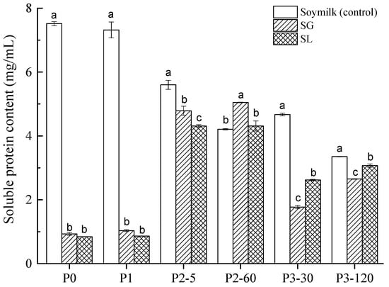 As shown in Figure 1, the amount of soluble protein in soymilk (7.52 mg/mL) was substantially higher (p < 0.05) than that in SG (0.93 mg/mL) and SL (0.84 mg/mL) and before digestion (P0 stage). This indicated that most of the proteins existed in a free state in soymilk, while in the SG and SL gels, most of the proteins remained in the gel matrix. The mechanisms of acid-induced gelation of soymilk gel, in general, consist of two steps: heat treatment-induced protein denaturation followed by acid addition to generate protein coagulation [22]. In the present study, the hydrophobic groups of soy protein in soymilk were exposed after heat treatment (100 °C, 5 min), and then soluble protein aggregates formed. The release of protons (produced by GDL hydrolysis or generated by LAB fermentation) neutralized the negative charges on the surface of soluble aggregates in cooked soymilk, the repulsion among soy proteins disappeared and aggregation occurred [23]. After high-speed centrifugation (10,000× g r/min for 15 min), the proteins remained in the soymilk gels and precipitated to the bottom of the centrifuge tube, while few proteins existed in the supernatant. Therefore, the protein solubility of SG and SL gels before digestion (P0) is expected to be much lower than that of soymilk. Similar results were observed for all investigated samples after buccal digestion (P1) compared to the P0 stage, which suggested that the α-Amylase had little impact on the amount of soluble protein. These results corroborate findings from a previous study [24], which compared the protein bioaccessibility of soymilk and soymilk curds generated by fermentation with different LAB strains, at both P0 and P1 stages, where much lower soluble protein contents were observed in the soymilk curds compared to soymilk.