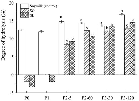 Degree of hydrolysis (DH) of soymilk (control), soymilk gel produced by GDL (SG), and soymilk gel induced by LAB (SL) samples subjected to in vitro GIS. Within the same digestion phase, different lowercase letters indicate significant differences (p < 0.05). P0 represents the sample before in vitro GIS digestion; P1 represents the sample after buccal digestion; P2-5 and P2-60 indicate samples collected at 5 min and 60 min of gastric digestion, respectively; and P3-30 and P3-120 indicate samples collected at 30 min and 120 min of intestinal digestion, respectively.