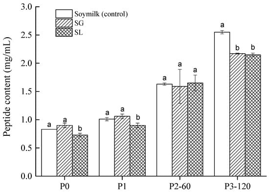 Peptide contents (<10 kDa) in soymilk (control), soymilk gel produced by GDL (SG), and soymilk gel induced by LAB (SL) samples. Within the same digestion phase, different lowercase letters indicate significant differences (p < 0.05). P0 represents the sample before in vitro GIS digestion; P1 represents the sample after buccal digestion; P2-5 and P2-60 indicate samples collected at 5 min and 60 min of gastric digestion, respectively; and P3-30 and P3-120 indicate samples collected at 30 min and 120 min of intestinal digestion, respectively.