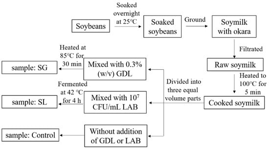 The process of preparing soymilk gels is shown in Figure 5. Soybean seeds (200 g) were soaked in 600 mL of distilled water at 25 °C for 12 h. The swollen soybeans were then ground using a soymilk blender (L18-Y915S, Joyoung Co., Ltd., Hangzhou, China) with another 1400 mL of distilled water. Subsequently, filtration was performed using a 160-mesh sterile gauze to collect raw soymilk (approximately 1580 mL), and then heated to 100 °C for 5 min. About 1500 mL of the cooked soymilk was taken and divided equally into three volume parts. The first part was cooled to approximately 85 °C and mixed with 0.3% (w/v) GDL. The mixture was transferred to a beaker and then heated at 85 °C in a water bath. The pH value was recorded as 5.6 after heating for 30 min (using a pH meter FE20, Mettler Toledo Technology (China) Co., Ltd., Shanghai, China), and the soymilk gel was obtained with the addition of GDL (SG). The second part of the cooked soymilk was cooled to approximately 42 °C in a water bath (kept at 42 °C) and inoculated with approximately 107 culture-forming units (CFU)/mL LAB strains. Before use, commercial lyophilized bacteria were suspended in sterile water. The pH values were noted hourly throughout the incubation period, and fermentation was terminated when the pH value approached 5.6 (approximately 4 h later) and the fermented soymilk gel (SL) was obtained. The third part of the cooked soymilk was set as the control.