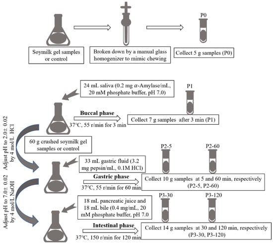 The in vitro gastrointestinal simulated digestion (GIS) was carried out as the method adapted from Hui and Xing (2022) [39]. The whole in vitro GIS digestion steps are shown in Figure 6. Firstly, both the soymilk gel samples (SG and SL) were crushed with a hand-held homogenizer to simulate the chewing process, and a 5 g sample was taken as the undigested sample, numbered P0. Then, 60 g of the crushed soymilk gel samples or control were collected, adding 24 mL of salivary amylase solution (0.2 mg α-Amylase/mL, dissolved in 20 mmol/L phosphate buffer, pH 7.0), and the mixture was shaken at a constant temperature of 37 °C on an electro-heating standing-temperature cultivator (DHP-9052, Yiheng Scientific Instrument Co., Ltd., Shanghai, China) at 55 r/min for 3 min, and 7 g of the sample was taken out as the sample after saliva digestion, numbered P1. Subsequently, 4 mol/L HCl was used to adjust the pH of the system to 2.0 ± 0.02, and then 33 mL of pepsin juice (3.2 mg pepsin/mL, dissolved in 0.1 mol/L HCl) was added. The rotation speed remained unchanged (55 r/min), and the gastric digestion time was 1 h. At the 5 min and 60 min of the gastric digestion phase, 10 g of samples were collected and numbered as P2-5 and P2-60, respectively. After gastric digestion, 4 mol/L NaOH was used to adjust the pH of the system to 7.0 ± 0.02, and 18 mL of pancreatic juice (0.4 mg pancreatin/mL, dissolved in 20 mmol/L phosphate buffer, pH 7.0) and 18 mL of bile solution (0.4 mg bile salts/mL, dissolved in 20 mmol/L phosphate buffer, pH 7.0) were added to simulate intestinal digestion for 2 h at 150 r/min. During this period, 14 g of samples were collected at 30 min and 120 min, respectively, and numbered as P3-30 and P3-120. To confirm that the protein content remained consistent across all samples, the digested samples collected at each digestion step were filled to 14 mL with distilled water.