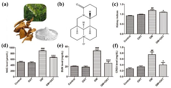 Chicago/Turabian StyleKang, Songyao, Tingting Chen, Zhihui Hao, Xiao Yang, Mingfa Wang, Zhifang Zhang, Sijia Hao, Fengting Lang, and Hongxia Hao. 2022. "Oxymatrine Alleviates Gentamicin-Induced Renal Injury in Rats" Molecules 27, no. 19: 6209. https://doi.org/10.3390/molecules27196209