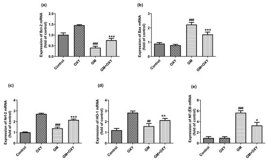 2.5. Oxymatrine Down-Regulated the Bax, NF-κB mRNAs Expression and Up-Regulated the Expression of Bcl-2, Nrf2 and HO-1 mRNAs