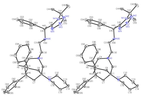 Crystals of 12B (m.p.: 161.5–162.5 °C) for crystal structure analysis were obtained from a solution in ethyl acetate via slow evaporation of solvent. All the measurements were performed using monochromatized Mo Ka radiation at 100 K: C39H51N7, Mr 617.86, monoclinic, space group C 2, a = 28.755(2) Å, b = 6.5924(5) Å, c = 22.8112(16) Å, b = 128.182(8)°, V = 3399.0(5) Å3, Z = 4, dcalc = 1.207 g cm−3, m = 0.073 mm−1. A total of 26,894 reflections were collected (Qmax = 27.0°), from which 7256 were unique (Rint = 0.0772), with 5244 having I > 2s(I). The structure was solved by direct methods (SHELXS-97) [] and refined by full-matrix least-squares techniques against F2 (SHELXL-2014/6) []. The nonhydrogen atoms were refined with anisotropic displacement parameters without any constraints. Owing to the absence of heavier elements, the absolute structure of the chiral molecule could not be determined reliably from the diffraction data and was chosen arbitrarily. The H atom bonded to N30 was taken from a difference Fourier map and refined without any positional constraints with an individual isotropic displacement parameter. The H atoms of the tertiary C–H groups were refined with individual isotropic displacement parameter and all X–C–H angles equal at a C–H distance of 1.00 Å. The H atoms of the CH2 groups were refined with common isotropic displacement parameters for the H atoms of the same group and idealized geometry with approximately tetrahedral angles and C–H distances of 0.99 Å. The H atoms of the phenyl rings were put at the external bisectors of the C–C–C angles at C–H distances of 0.95 Å, and common isotropic displacement parameters were refined for the H atoms of the same ring. The H atoms of the methyl groups were refined with common isotropic displacement parameters for the H atoms of the same group and idealized geometries with tetrahedral angles, enabling rotations around the C–C bonds, and C–H distances of 0.98 Å. For 443 parameters, final R indices of R1 = 0.0513 and wR2 = 0.1010 (GOF = 1.007) were obtained. The largest peak in a difference Fourier map was 0.215 e/Å−3
