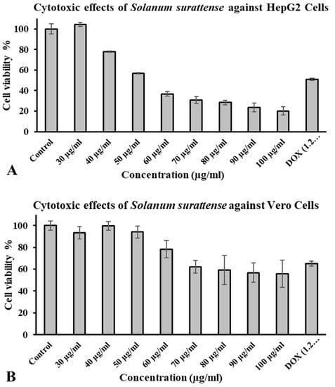 The HepG2 and Vero cell lines were grown in a 96-well cell culture plate up to 70% confluence in respective media for 24 h. Subsequently, the cells were treated with different concentrations (30, 40, 50, 60, 70, 80, 90, and 100 µg/mL) of S. surattense fruit extract and vehicle (DMSO control) for another 24 h. The cells were washed using a phosphate buffer saline (PBS) following the media aspiration. The WST-8 solution was added (10 μL/well in 100 μL DMEM) [42,43], and the plate was incubated for 4 h at 37 °C in the dark. The water-soluble, orange-colored WST-8 formazan product was analyzed by reading the absorbance using an ELISA plate reader at a test wavelength of 450 nm [44] and a reference wavelength of 630 nm. Each experiment was repeated for at least 4X prior to the data plotting a graph. Meanwhile, the untreated cells were considered the control [45], and Doxorubicin (1.2 µg/mL)/(2.21 µM) was used as a positive control [46].