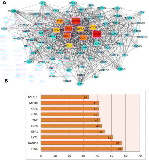 The target genes were imported into the STRING database for the PPI network. The relationship between many targets throughout disease development is depicted in the PPI network by nodes and their related interactions. Later, the Cytohubba plugin was used to find the hub genes in the network. Tumor protein 53 (TP53)-, (AKT1), ESR1, EGFR-43, TNF, HIF1A-, HRAS-, MTOR-41 and apoptosis regulator Bcl-X BCL2L1- showed the highest degree (Figure 2). The highest degree indicates that the targeted genes are highly connected, implying that all of them could be important targets. After correlating the outcomes to those received by KEGG analysis, eight targets AKT1, ESR1, EGFR, TNF, HIF1A, HRAS, MTOR, and BCL2L1, were chosen for further molecular docking analysis.