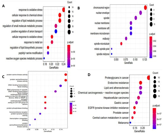 Potential biological functions of S. surattense targets were discovered using GO annotation and pathway enrichment studies. According to GO enrichment analysis, the key targets were associated with oxidoreductase activity, peptidyl–serine modification, nuclear receptor activity, etc. Using KEGG pathway analysis, relevant signaling pathways related to S. surattense anti-cancer action were identified. GO enrichment and KEGG analysis reveal that hub genes were significantly enriched genes (Figure 3).