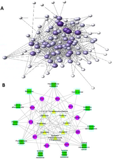 (A) Compound–target network. (B) Compound–target–pathway network; central yellow color triangles represent active compounds of S. surattense, hub gene represented by purple-colored circles, and outer green color squares represent modulating pathways.