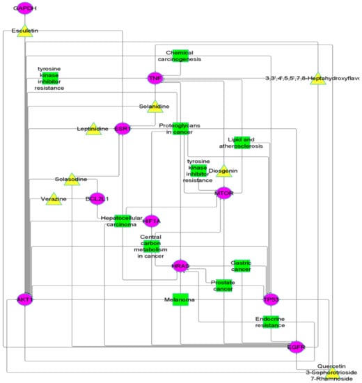The network between hub genes, active constituents, and KEGG-enriched pathways was constructed by Cytoscape (version 9). A network analyzer was used to analyze the network; 34 nodes and 74 edges were found in the compound target pathway network (Figure 4). The 74 edges show the interactions between anti-cancer targets of S. surattense and their pathways.