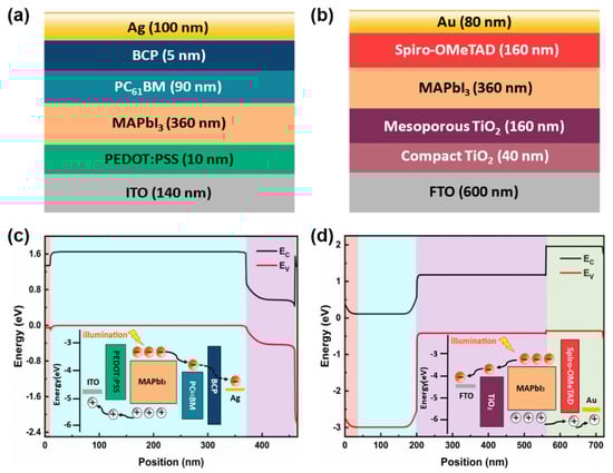 Figure 1 depicts the energy band diagrams of the inverted and regular structure photodiodes and the process of carrier generation, separation, and transport. Without considering the doping type and density of the perovskite, the carrier extractions at the interfaces are only influenced by the highest occupied molecular orbital (HOMO)/lowest unoccupied molecular orbital (LUMO), the Fermi levels, and the bandgaps of the respective functional layers. Due to the band alignment, the electrons and holes drift in opposite directions. The electrons are injected into the ETL and transported to the cathode, whereas the holes are injected into the HTL and transported to the anode. The extraction of photo-induced electrons and holes occurs at the perovskite/ETL and perovskite/HTL interfaces, respectively [27,28,29]. To analyze the performance of the photodiodes with doped active layer, a coupled opto-electronic model is created for inverted (Indium Tin Oxide (ITO)/Poly (3,4-Ethylenedioxythiophene):Poly (Styrenesulfonate) (PEDOT:PSS)/Methylammonium Lead Iodide (MAPbI3)/(6,6) Phenyl-C61-Butyric Acid Methyl Ester (PC61BM)/Bathocuproine (BCP)/Ag) and regular (Fluorine-doped Tin Oxide (FTO)/Compact Titanium Dioxide (TiO2)/Mesoporous TiO2/MAPbI3/2,2′,7,7′-Tetrakis (N,N-di (4-Methoxyphenyl)Amino)-9,9′-Spirobifluorene (Spiro-OMeTAD)/Au) structures. The schematics of both inverted and regular structure photodiodes are illustrated in Figure 1a,b, where the thickness of each layer is indicated on the respective images.