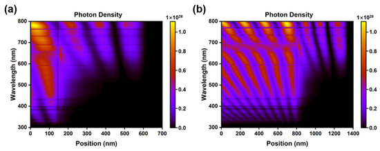 To analyze carrier generation in perovskite photodiodes, the generation rates are calculated separately at five wavelengths ranging from 300 to 700 nm. As displayed in Figure 2, under light illumination, the perovskite layers absorb incident photons, and, due to the planar surface at each side of the active layer, resonances appear. It can be observed that the carrier generation at different wavelengths decays exponentially with the position coordinate, and the generation rate is maximum at the initial position, which is the position of light incidence. With the increase in incident wavelength, the absorption coefficient of perovskite and, correspondingly, the photon flux decreases gradually, which leads to a decrease in the carrier generation rate. The optical simulation software of GPVDM is used to simulate the photon spectral absorption at different thicknesses of devices under AM1.5G solar spectrum, which is illustrated in Figure 2a,b. The cut-off wavelength of the perovskite materials is 775.5nm, which can be estimated from the expression , where (=1.6 eV) is the band gap of MAPbI3, (=4.136 × 10−15 eV·s) is Planck’s constant, and (=3 × 108 m/s) is the light speed. By sectioning the photon density image parallel to the position of the active layer, the generation rate curves at different wavelengths are obtained.