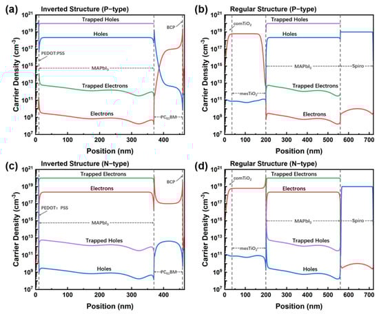Carrier distribution under (a,b) P-doped and (c,d) N-doped perovskite conditions where (a,c) are for the inverted-structure photodiode and (b,d) for the regular-structure photodiode. The position refers to the cross-sections of the inverted structure and the regular structure, respectively. The dashed grey lines are used to identify each layer in the perovskite photodiodes.