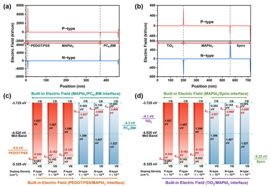 To further verify the effect of perovskite doping density and type on the built-in electric field, perovskite photodiodes with both inverted and regular structures were simulated, which are widely used in various types of optical and electrical performance simulation. The simulated structure and thickness of each layer of the perovskite photodiode are mentioned in the structural diagram of Figure 1a,b. The parameters used for the coupled opto-electrical model are listed in Tables S1 and S2, Supplementary Materials. At the interface between the perovskite active layers and the carrier transport layers, the interface electric fields are constructed due to the differences in energy levels. With the change in perovskite doping types and densities, the strength and direction of the interface electric fields change accordingly, as shown in Figure S2a,b, Supplementary Materials. To further reveal the reason for the electric field change, the shift in the Fermi level position of perovskite under different doping types and densities needs to be accurately dissected according to Figure 4c,d. In the case of perovskite P-doping, it is clearly observed that the Fermi level gradually approaches the valence band with increasing doping densities. In contrast, the Fermi level shifts to the CB with increasing doping densities under perovskite N doping. Due to the difference in energy levels of different materials, electrons flow from high energy levels to low energy levels, forming electric fields with different directions.