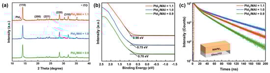 (a) X-ray diffraction (XRD) results of perovskite samples with various precursor ratios. “*” refers to ITO. (b) X-ray photoelectron spectroscopy (XPS) of MAPbI3 films under different precursor ratios. (c) Time-resolved photoluminescence (TRPL) measurements of the Glass/ITO/MAPbI3 sample under different precursor ratios.