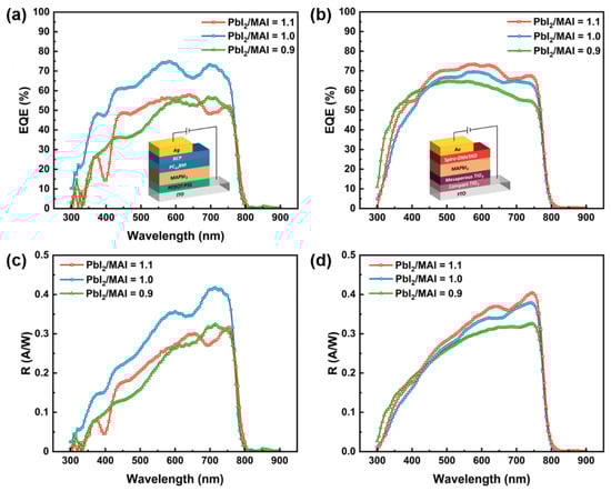Variation in EQE and responsivity with wavelength under different precursor ratios annealed at 80 °C for 10 min, where (a,c) are for inverted structure photodiode and (b,d) are for regular structure photodiode.