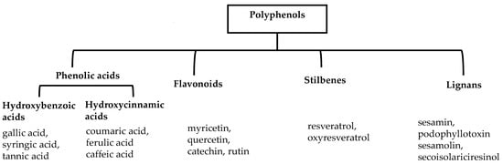 Polyphenols are a well-known group of phenolic systems characterized by at least two phenyl rings and one or more hydroxyl substituents [20]. Polyphenols can be found in all organs of plants. It is generally believed that flavonoids have weak resistance to diverse environmental stresses (heat, light, and oxidation). Polyphenols synthesized by plants can be simply divided into flavonoids and non-flavonoids. Polyphenols can be classified according to their chemical structure, whether they contain sugar or not, or by whether they are hydrolyzed or condensed. The sugar in polyphenol stabilizes the aglycone, increases its water solubility, and enhances its bioavailability and biocompatibility [21]. They can even be classified according to their resolution. Moreover, it can be classified based on its solubility or origin, for example, based on the plant or mammals that provide it [22]. As shown in Figure 1, polyphenols fall into four groups based on their chemical structure: phenolic acids, flavonoids, stilbenes, and lignans.