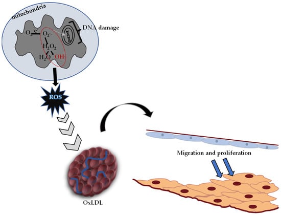 Figure 4. Reactive oxygen species (ROS) causing oxidative stress, oxidized low-density lipoprotein (OxLDL) and atherosclerotic plaque formation (adapted from ref. [129]).