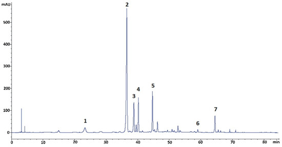 RP-LC/PDA chromatogram (registered at 260 nm) of isoflavonoids found in the kudzu root lyophilisate. Compounds: 1 = 3′-hydroxypuerarin; 2 = puerarin; 3 = 3′-methoxypuerarin; 4 = mirificin; 5 = daidzin; 6 = ononin; 7 = formononetin.