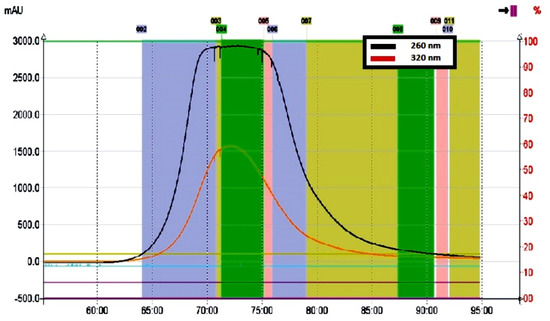 A rectangular, symmetrical peak shape was recorded for the entire isoflavone fraction, as is usually observed in the displacement chromatography model (Figure 3). Similar peak profiles were previously described by Ito and Ma [39] for separation processes of various compounds using pH-zone-refining CCC, based on controlled pH in both the stationary and mobile phases. In our study, the addition of an appropriate volume of acetic acid lowered the pH in the biphasic solvent system and made it possible not only to remove more hydrophobic ballast compounds, retained in the stationary phase, but also to reduce the ionization of free phenolic groups in the molecules of mirificin and related polar isoflavone glycosides (Figure 2). Ultimately, this led to efficient pre-concentration and subsequent rapid elution of the entire fraction of polar isoflavones between 70 and 75 min (Figure 3).