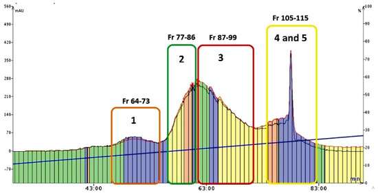 Due to the addition of an acidic modifier to the solvent system, a significant improvement in the separation efficiency of the lyophilisate components was observed during the CPC run. Lowering the pH in the mobile phase resulted in inhibition of dissociation of phenolic and carboxyl/hydroxyl substituents in the molecules of kudzu lignans and sapogenins/saponins, respectively, followed by more intense migration of these ballast compounds to the upper (stationary) phase. On the other hand, the optimized KD value for the solutes of interest resulted in a high distribution of the polar puerarin and daidzein derivatives into the lower (mobile) phase (Figure 3).