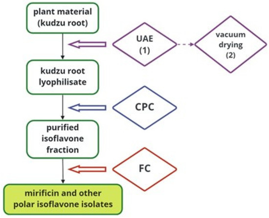 To better illustrate the detailed protocol developed for preparative-scale isolation of kudzu root constituents, Figure 5 schematically shows all the techniques used on the way from plant material to bioactive isoflavone components.