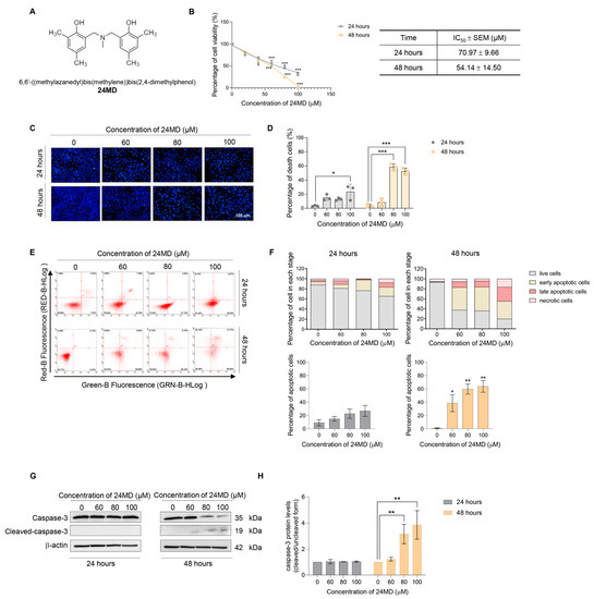 Effect of 24MD on cell viability and apoptosis inducing activity for 24 and 48 h of treatment. (A) the chemical structure of 24MD. (B) The MTT assay was performed to evaluate the cytotoxicity of 24MD. A549 cells were treated with various concentrations of 24MD (0–100 μM) for 24 and 48 h. The percentage of cell viability was calculated by comparison with non-treatment control. The half maximal inhibitory concentration (IC50) of 24MD at 24 and 48 h against A549 cells were estimated by using a linear regression equation. (C,D) Morphological changes of nucleus after treatment of 24MD (0–100 μM) for 24 and 48 h were examined by nuclear staining assay with Hoechst 33342. Fragmented chromatin of apoptotic cells was visualized with condensed blue fluorescence. The percentage of apoptotic cells was calculated. (E,F) A549 cells were treated with 24MD (0–100 μM) for 24 and 48 h before being subjected to evaluate apoptosis inducing activity by flow cytometry with annexin V FITC/propidium iodide (PI) staining. The percentage of cells in each stage and percentage of apoptotic cell death were demonstrated. (G,H) Key molecular protein of apoptosis inducing activity, caspase-3 was evaluated by Western blot analysis after 24MD (0–100 μM) treatment for 24 and 48 h. Densitometric analysis was performed, and the result was represented in relative protein levels when compared with non-treatment control at each time point. β-actin protein was measured to confirm equal loading in each sample. The data are demonstrated as mean ± SEM (n = 3) (* 0.01 ≤ p < 0.05, ** 0.001 ≤ p < 0.01 and *** p < 0.001 when compared with non-treatment control).