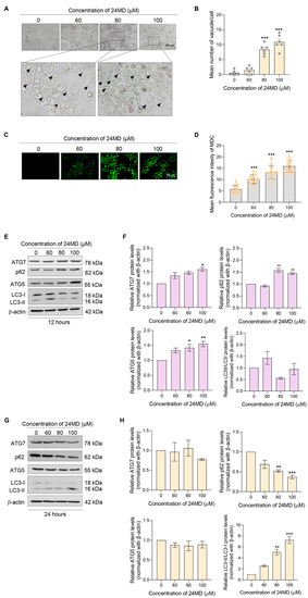 Autophagy is involved in the delivery of cytoplasmic cargoes for degradation and can be defined by the accumulation and increase of autophagic vacuoles in the cells [25]. Therefore, the cytoplasmic vacuoles were observed after treatment with various concentrations of 24MD (0–100 µM) for 24 h. The number of cytoplasmic vacuoles increased at 80–100 µM 24MD (Figure 2A,B). The A549 lung cancer cells were then treated and stained with monodansylcadaverine (MDC) to further identify the autolysosomes. The mean fluorescence intensity of MDC in a 24MD-treated group was significantly elevated compared with that in the nontreatment control (Figure 2C,D).