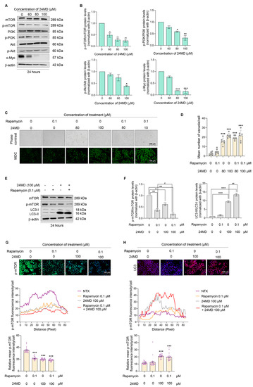 mTOR inhibition induces autophagosome formation. Rapamycin, a mTOR inhibitor, has been shown to induce autophagy and widely used for autophagy induction. Here, the induction of autophagic effect was first evaluated by MDC staining after 100 µM 24MD treatment with or without 0.1 µM rapamycin. The results exhibited that the combination of 24MD and rapamycin notably increased the mean fluorescence intensity compared with that in the nontreatment control but did not alter the intensity compared with that in the 24MD treatment alone (Figure 3C,D).