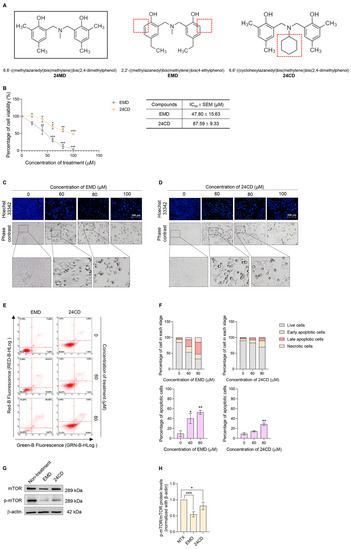 To demonstrate the structural related activity of 24MD, other benzoxazine dimer analogues, EMD and 24CD were applied for activity comparison. (A) Comparison of chemical structure between 24MD, EMD and 24CD. (B) The MTT assay was performed to evaluate the cytotoxicity of EMD and 24CD. A549 cells were treated with various concentrations of EMD and 24CD (0–100 μM) for 24 h. The percentage of cell viability was calculated by comparison with non-treatment control. The half maximal inhibitory concentration (IC50) of EMD and 24CD at 24 h against A549 cells were estimated by using linear regression equation. (C,D) Nuclear staining with Hoechst 33342 was performed to access morphological changes of nucleus after EMD and 24CD treatment (0–100 μM) for 24 h. The morphological changes of the A549 cells were visualized under phase contrast microscope. (E,F) A549 cells were treated with EMD and 24CD (0–80 μM) for 24 h before being subjected to evaluate apoptosis inducing activity by flow cytometry with annexin V FITC/propidium iodide (PI) staining. The percentage of cells in each stage and percentage of apoptotic cell death were demonstrated. (G,H) The effect of EMD and 24CD against mTOR and p-mTOR was examined by Western blot analysis. β-actin protein was evaluated to confirm the equal loading of protein in each sample. Densitometry of each protein levels was calculated, and the results were demonstrated in relative protein levels. Data represent the mean ± SEM (n = 3) (* 0.01 ≤ p < 0.05, ** 0.001 ≤ p < 0.01 and *** p < 0.001 when compared with non-treatment control).