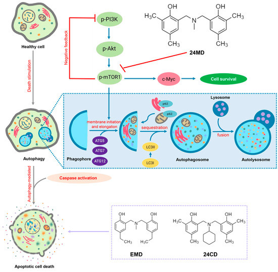 Autophagy is a multi-step catabolic process which controls cellular homeostasis and response to stress stimulation. As mTOR is the main autophagic suppressor, the type I PI3K-Akt-mTOR signaling which plays an important role is inhibited under the autophagic induction. The phagophore is generated, while ATG5-ATG12 associated with ATG7 is activated for vesicle elongation and completion. The other key marker which is involved in this step is LC3. LC3I is transformed to an autophagic-vesicle associated form LC3II. This cleaved form is designated as a marker of autophagy. The vesicle engulfs the cytosolic material which is recruited by a cargo receptor such as SQSTM1/p62. Then, a maturated autophagosome fuses with lysosomes to become autolysosomes. The engulfed material is degraded by acidic hydrolases and lysosomal enzymes. Autophagic-mediated apoptosis cell death is a process in which the autophagic induced apoptosis mechanism through degradation of the anti-apoptotic protein leads to activating the caspase cascade. 24MD could enhance autophagic-mediated apoptosis cell death by inhibiting mTOR signaling. However, the different substituted groups, EMD and 24CD, could only demonstrate the apoptosis inducing activity.