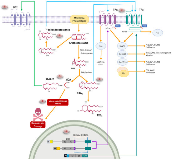 Schematic for TXA2 biosynthesis and signaling. Eicosanoid Synthesis (1) begins with the release of arachidonic acid from membrane phospholipids by phospholipase A2. Arachidonic acid is either metabolized to PGH2 by the cyclo-oxygenase enzymes or is attacked by oxygen free radicals to produce F-series isoprostanes (2). TXA2S then metabolizes PGH2 into either TXA2 (1) or 12-HHT and MDA (3). MDA forms DNA and Protein adducts to cause cellular damage and cell death (4) while BLT2 activation by 12-HHT enhances tumor formation (5). TP isoforms are derived from alternative splicing with TPα expression driven by promoter 1 and 2 (P1, P2) (6). TXA2 and F-series isoprostanes activate TP (7) to produce propagate carcinogenesis.