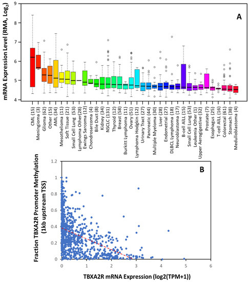 TBXA2R Expression is Increased in The Majority of Tumors. (A) Expression of TBXA2R mRNA in 36 different cancer cell types. Data are mean ± SD showing 95% CI. Numbers above descriptors on the X-axis denote the number of individual cell lines from which the data were derived. (B) TCGA data from 59,132 patients’ samples showing the correlation between TBXA2R mRNA expression and methylation of the promoter (within 1 kb of transcriptional start site (TSS)). Red dotted line denotes linear correlation (R2 = 0.442).