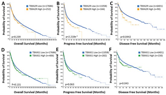 Elevated TBXA2R and TBXAS1 Expression Is Associated with Poor Prognosis. Data from the TCGA pan-cancer database for TBXA2R (A–C) and TBXAS1 (D–F) was correlated with overall (A,D), progression free (B,E) and disease free (C,F) survival in patient populations with low (♦) and high (♦, TBXA2R; ♦, TBXAS1) expression. n = number of patients in the cohort.
