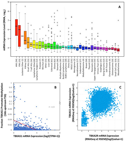 TBXAS1 Expression is Dysregulated in Multiple Tumors. (A) Expression of TBXAS1 mRNA in 36 different cancer cell types. Data are mean ±SD showing 95% CI. Numbers above descriptors on the X-axis denote the number of individual cell lines from which the data were derived. (B) TCGA data from 59,132 patient samples showing the correlation between TBXAS1 mRNA expression and methylation of the promoter (within 1 kb of transcriptional start site (TSS)). Red dotted line denotes linear correlation (R2 = 0.029). (C) Correlation of TBXA2R and TBXAS1 expression for cancers in the TCGA pan cancer dataset.
