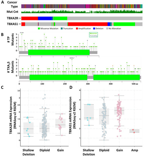 Cancer is a problematic condition from a therapeutic viewpoint. Therapy resistance to treatments such as chemotherapy, radiotherapy and targeted therapies is a significant problem, with the mechanisms producing insensitivity resulting in more aggressive clones that contribute to poor prognosis [112]. In part, resistance mechanisms are driven by genomic instability, high mutation rates, and epigenetic changes in the cancer cell and/or the tumor microenvironment, with differences observed between early and advanced stages of cancer [112]. Mutation rates of TP and TXA2S in the TCGA pan-cancer dataset suggests that both targets are poorly mutated in cancer (1.1% for TBXA2R and 1.7% for TXAS1) (Figure 5A). When examining the specifics of the mutations, the changes in the TXA2R gene are almost evenly split between (36%, ■), deletion (30.6%, ■) and missense/truncating mutations (29.9%, ■/■). Truncation mutations in TP producing tail-less truncation mutants would still be functional and contribute to carcinogenesis. Conversely, all other truncation mutations would produce non-functional (potentially unstable) receptors, as would the point mutations at R60 and E129. All other mutations are of unknown consequence but are not predicted to be driver mutations. Mutation of TBXAS1 in this pan-cancer panel is, philosophically, quite different (Figure 5A). For TBXAS1, 61.7% of all mutations are amplifications, which may contribute directly to the overexpression of this gene in many tumors, while only 3.5% of changes are deletions and 32.3% are missense/truncating mutations. Similar to TBXA2R mutations, most missense mutations in TBXAS1 are of unknown consequence and not predicted to be driver mutations. Given that these genetic alterations are in a minority of tumors, it is perhaps not surprising that the correlation between mRNA expression and allele number suggests that the enhanced expression of TP and TXA2S is derived primarily from diploid tumor cells (Figure 5C,D). These data indicate that TXA2 signaling provides a stable target in a landscape of perpetual phenotypic and genomic instability.