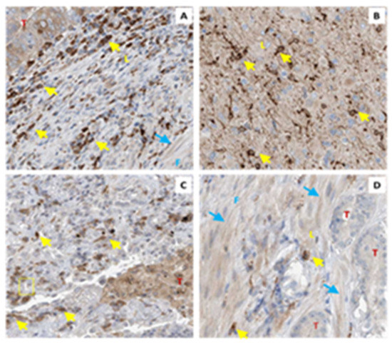 TXA2S is Expressed in Tumor Stroma. Biopsies from colorectal (A) brain (B), lung (C) and prostate (D) cancer were immunostained with antibodies against TXA2S. Tumor (T), leukocytes (L, ←) and fibroblasts (F, ←) all stain positively. Data are from the human protein atlas.