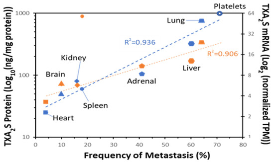 TXA2S expression is elevated in common sites of metastasis. TXA2S protein (blue) and RNA (Orange) expression was graphed against the frequency of metastasis from breast cancer (RNA expression from human protein atlas, metastasis data from [137]).