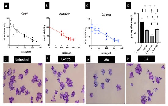 Cellular cytotoxicity (A–C); clonogenic assay statistical analysis of plating efficiency (PE) of tested groups blotted at the X axis, PE % = the number of colonies formed/number of cells plated) × 100 blotted at the Y axis, the untreated group showed the highest PE while the LAA group showed the least PE, being significantly lower than the CA, control and untreated groups. * Significance at p < 0.05, ** Significance at p < 0.001, **** Significance at p < 0.0001, ns No significant difference. (D) Clonogenic assay images showing cell colonies stained with crystal violet imaged using inverted light microscope X40 (Olympus CKX41SF, Tokyo, Japan) (E–H). Untreated (E); control (A,F); L-ascorbic acid (B,G); citric acid (C,H).