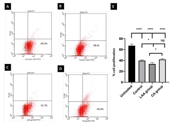 Ki-67 flow cytometry proliferation assay. Untreated (A); control (B); L-ascorbic acid (C); citric acid (D). Statistical analysis for the cell proliferation of different groups blotted on X axis and % of proliferation on Y axis, where proliferation of cells in all groups was significantly lower than the untreated group. **** Significance at p < 0.0001, LAA group showed the lowest proliferation compared to the crude callus-treated (control) and CA-treated groups. * Significance at p < 0.05; there was no significant difference between the control and CA groups (ns) (E).