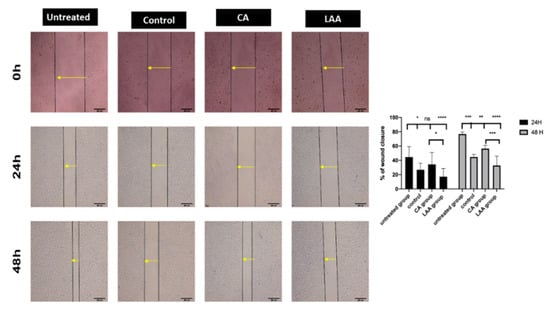 A comparison between untreated cells and the control-, LAA- and CA-treated groups was based on measuring the percentage of wound closure—a decrease in this percentage was taken as an indication of the decrease in cells’ migratory ability. Areas were quantified using Image J software (1.52p software 32, NIH, USA). The results showed that the least average wound closure percentage was for the LAA-treated group, with 17% after 24 h and 33% after 48 h. This was significantly less than that of the control- and CA-treated groups, showing 26% and 34% after 24 h, and 44% and 56% after 48 h, respectively (Figure 4).