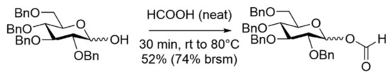 With the goal of simplifying the glycosylation reaction and making it more atom-economic, we previously developed a new efficient synthesis of glycosyl formates, which avoids the use of reagents and catalysts. The hemiacetal of the donor was simply treated with formic acid giving the new donor and recovered starting material (Scheme 1) [16]. The simplicity of the method contrasts with the previous syntheses of glycosyl formates, where glycosyl halides [19,20,21] thioglycosides [21] or coupling reactions (EDC) [21] were required. All these procedures produce at least a stoichiometric amount of waste.