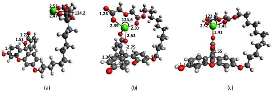 In Section 2.2, vinyl, enol and enolate were utilized as simple models for the phenol and phenoxy core. Chromophore 5 and 5a utilize full phenol and phenolate structures and thus serve as better models to examine the interactions of key contributors in 1, referred to as fragments, with cations. This section seeks to understand the structure of chromophore-receptor-cation complexes, utilizing fully functional models, albeit not bonded together via an extended arm. In methanol medium, 5 interacts with Ca2+, resulting in the elongation of the lactone C7-O11 and carbonyl C10-O13 bonds to 1.48 and 1.23 Å, respectively (Figure 6a). The aromatic C-C and the ring-linkage C4-C7 bonds remain practically unchanged.